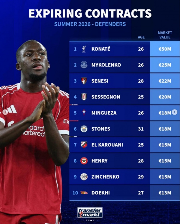 旺财28平台-德转列今夏合同到期十大后卫球员身价,科纳特5000万欧居首